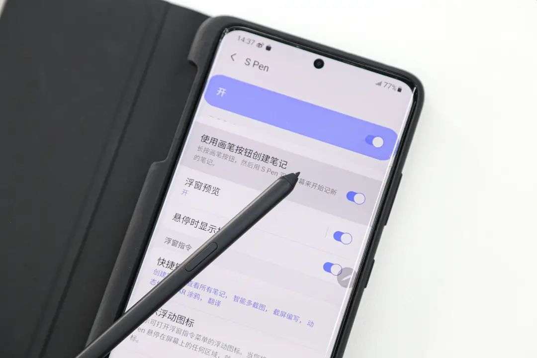 不过 Note 系列还是保持了许多关于 S-Pen 的独有特色,因为 S21 Ultra 支持这跟 S-Pen 并不支持蓝牙,无法与手机进行配对,自然也就无无法实现隔空操作,笔上按钮目前的唯一作用就是当橡皮擦使用。