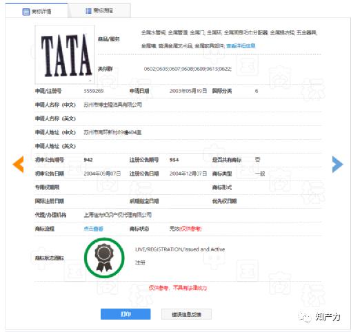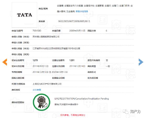 ▲ 苏州博士隆第7691580号“TATA”第6类商标(来源:中国商标网)