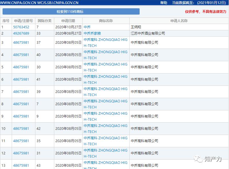 据中国商标网显示,截至2021年1月11日,共有110件“中乔”相关的商标申请,但110件“中乔”相关商标中没有1件由乔丹体育申请。