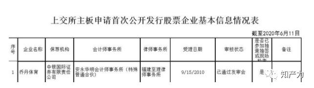2020年6月11日,中国监会发布了最新版本的《上交所首次公开发行股票正常审核状态企业基本信息情况表》,其中,申请在上交所主板首次公开发行股票的企业信息表中,乔丹体育依然排在首位。