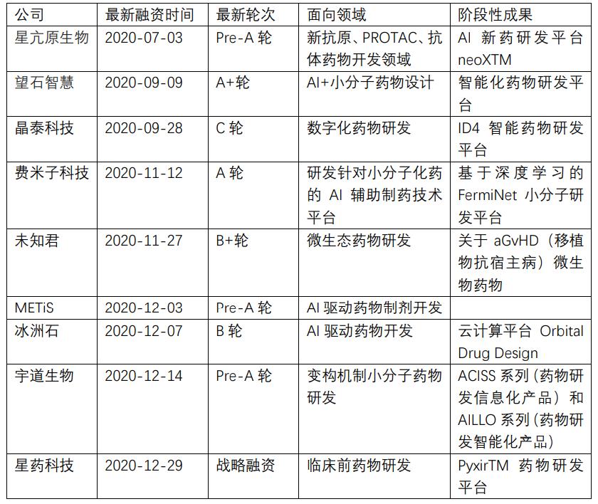 国内部分“AI+制药”行业相关公司2020年融资情况