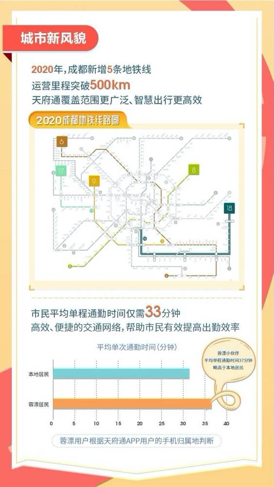 1月11日,天府通公司对外发布《2020天府通公交大数据报告》。报告显示,2020年,成都新开通5条地铁线路,运营里程突破500KM,超6成市民用户使用移动支付扫码乘地铁,市民平均单程通勤时间仅需33分钟。