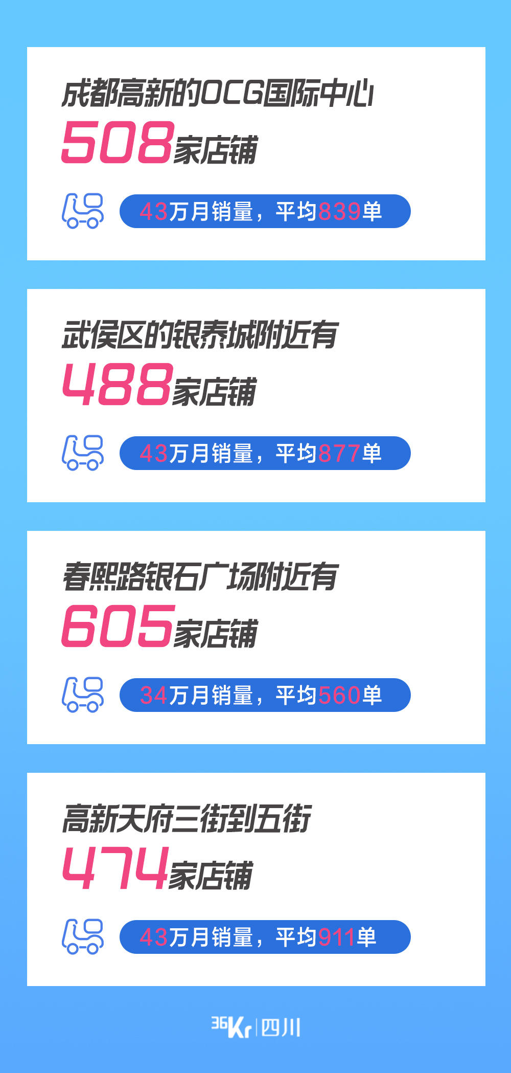 而成都上班族点外卖的数量,能支撑起一个店铺每月高达900单的数量,在写字楼集中的区域,外卖月销量能达到43余万单,这个月销量数据已经可以和深圳的南山区比肩了——深圳南山区的深海大道附近约有711家店铺,月销量49万单左右,店铺平均销量685单。