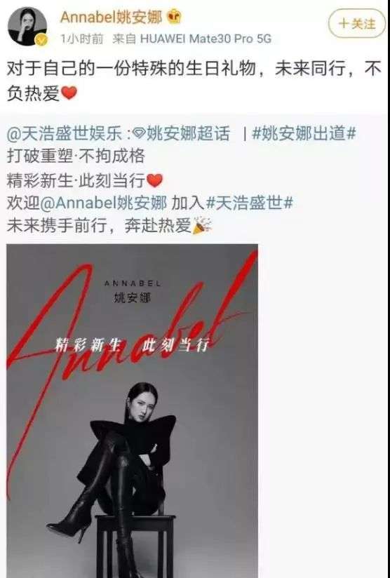 1月14日,@天浩盛世娱乐官方微博发布消息,表示欢迎姚安娜加入。姚安娜是谁,对于大部分网友已不算陌生,她是任正非的小女儿,出生于1998年1月14日。随后,姚安娜转发微博,声称这是一份特殊的生日礼物,“未来同行,不负热爱”。