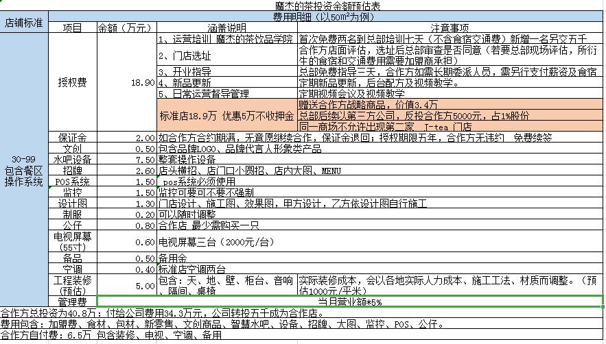 根据《商业数据派》独家拿到的招商加盟书显示,以“魔杰的茶”为例,以50平米/店计算,商家加盟的前期投入多达15项,其中包括18.9万元的授权费、2万元的保证金以及室内软硬件等,单店累计投资额超过40万,这还不包括与业绩挂钩的5%管理费。