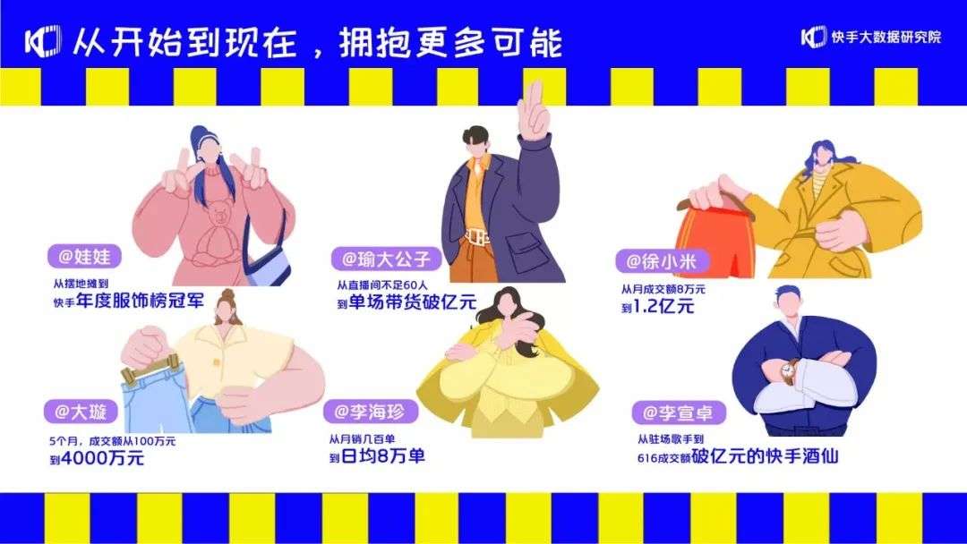 根据快手2020年11月发布的报告,机构主播@瑜大公子 刚开始直播间不足60人,如今单场直播带货破亿;主播@徐小米 从月成交额8万上涨到1.2亿;主播@李海珍 从月销几百单飙升至日均8万单……