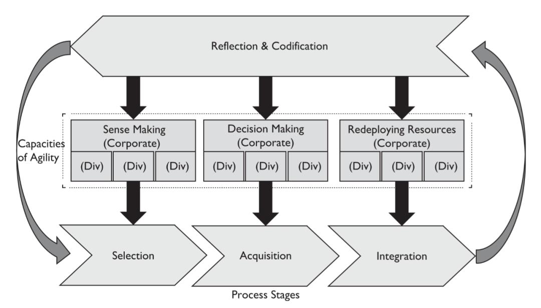 所以一些思考工作必须前置到选择并购目标时。哈佛商学院曾设计过一个思考模型,由四个相互依赖的要素组成:客户价值主张(customer value proposition,可以更高效的完成客户需求)、利润公式(profit formula,收入模型和成本结构)、公司用来交付产品所需的资源(resources,例如员工、销售网络、技术、产品和现金等资源)、组织架构与流程(processes,例如制造、研发、销售等流程)。