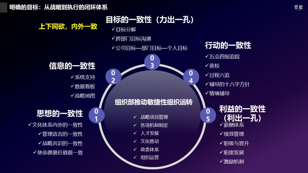 第二是业务目标的一致性,把被并购公司的关键数据,融入整个战略地图,并且信息共享,跟着大目标走。这需要一个专门的团队,来带领对方做目标拆解,以及去做一些跨部门的沟通,融入新的组织架构中。
