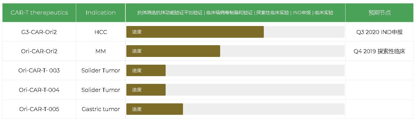 依托「原能细胞」,「原能医学」构建了四个自有创新技术平台:OriTMAb抗体开发技术平台、OriTMCAR自主创新型CAR-T技术平台、 OriTMTIL细胞高效扩增培养技术平台和OriTMUCAR技术平台;并开发了8条自主创新靶向实体瘤的免疫细胞治疗产品管线;已启动注册临床申报2项,并开展探索性临床研究6项。