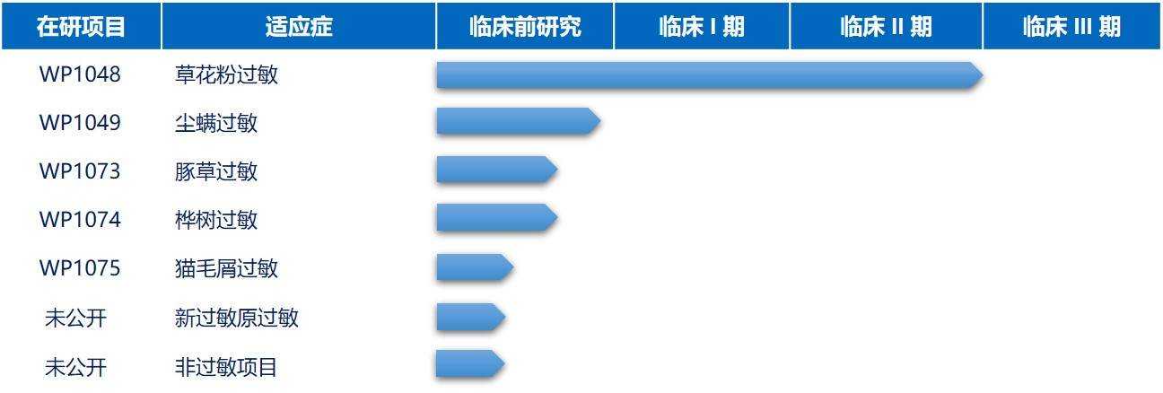 具体而言,WP1048是用于治疗草花粉过敏的生物制剂,其活性成份由基于PCFiT技术产生的四种重组蛋白组成。以这四种蛋白作为抗原,可以诱导产生针对四种最主要的草花粉变应原Phl p 1,Phl p 2,Phl p 5和Phl p 6。已有研究结果证明,上述4个梯牧草变应原的抗原表位与其他草种的变应原有明显的交叉反应性。关于WP1048项目,「百明信康」已经完成四项I/II期的临床试验,并已初步证明该产品的安全性和临床疗效。