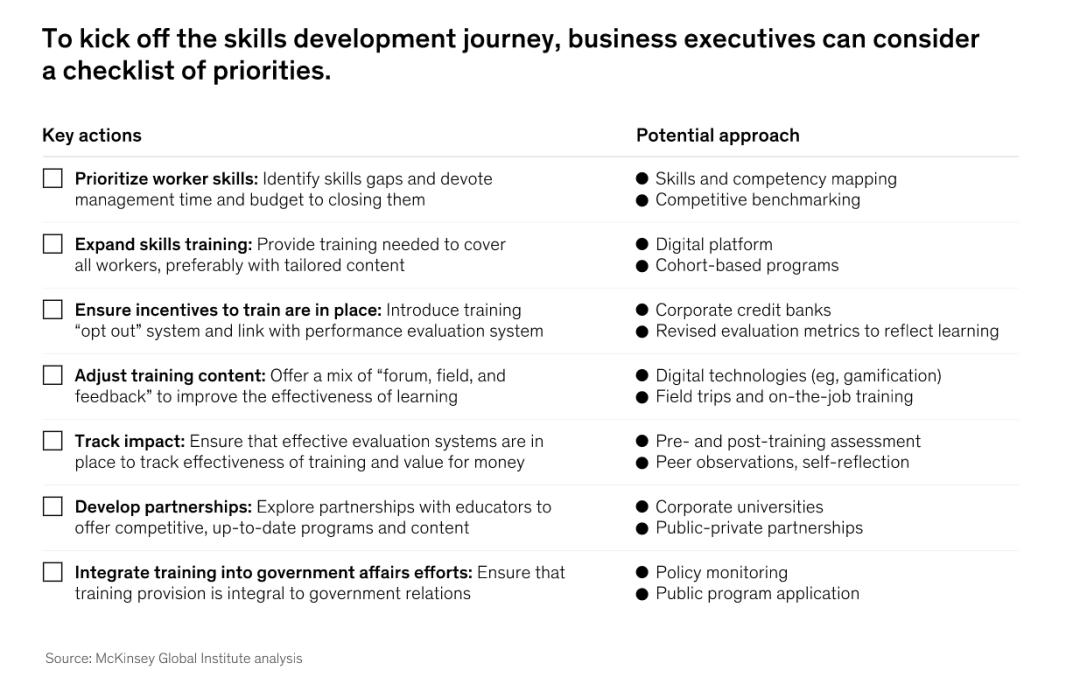 为了公司及其员工开启旅程,企业高管牢记优先级事项清单,从确定技能差距、把更多的管理时间用于培训工人的广泛问题,到发展与教育工作者的伙伴关系,并确保培训是公司与政府关系努力的一个组成部分(图4)。