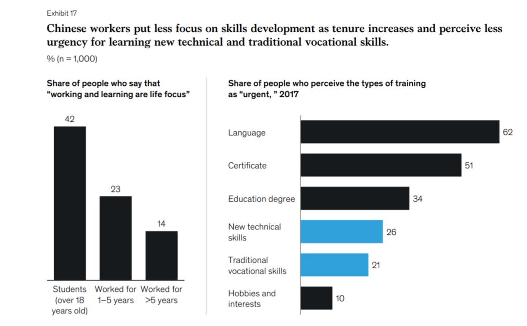 随着就业时间的增加,中国工人对技能发展的关注越来越少,他们认为学习新的技术和传统职业技能的紧迫性也越来越小。