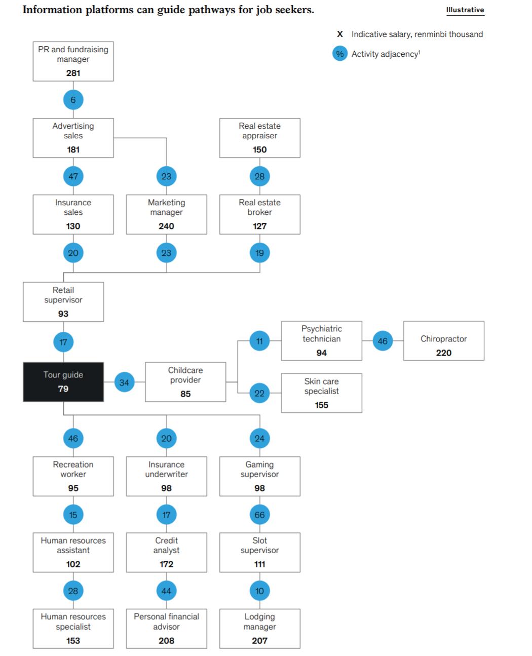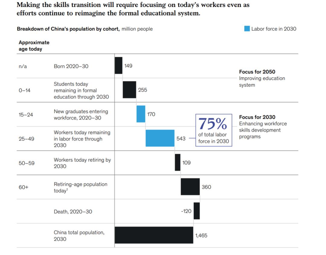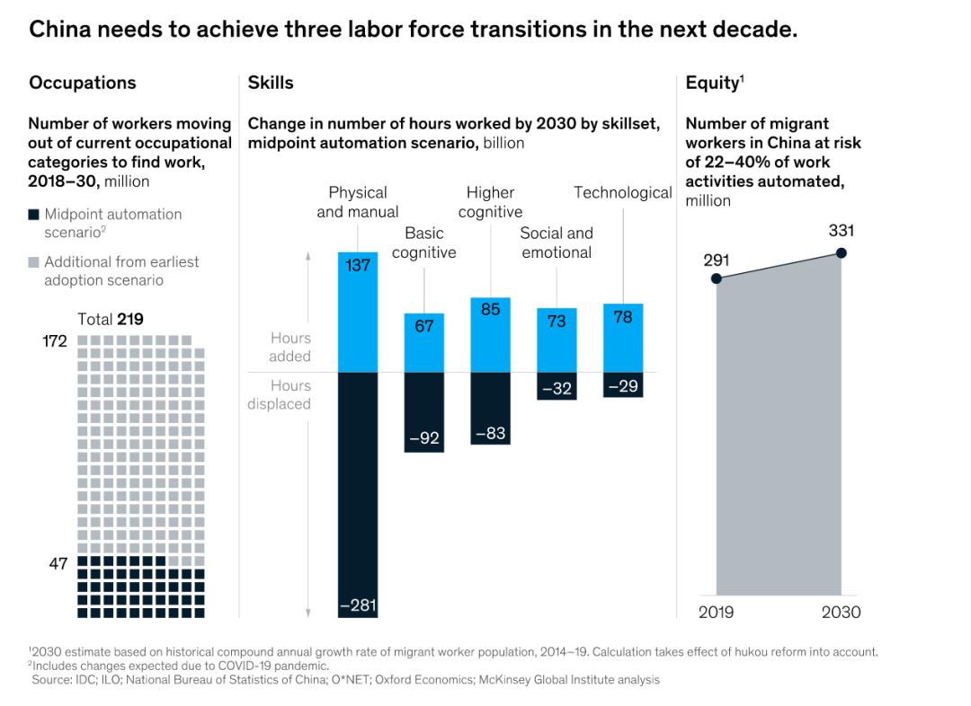职业。到2030年,多达2.2亿中国工人可能需要转换职业,占中国劳动力总数30%,大约是麦肯锡全球研究所(MGI)未来工作模型预估全球需要转型劳动力总量的36%。