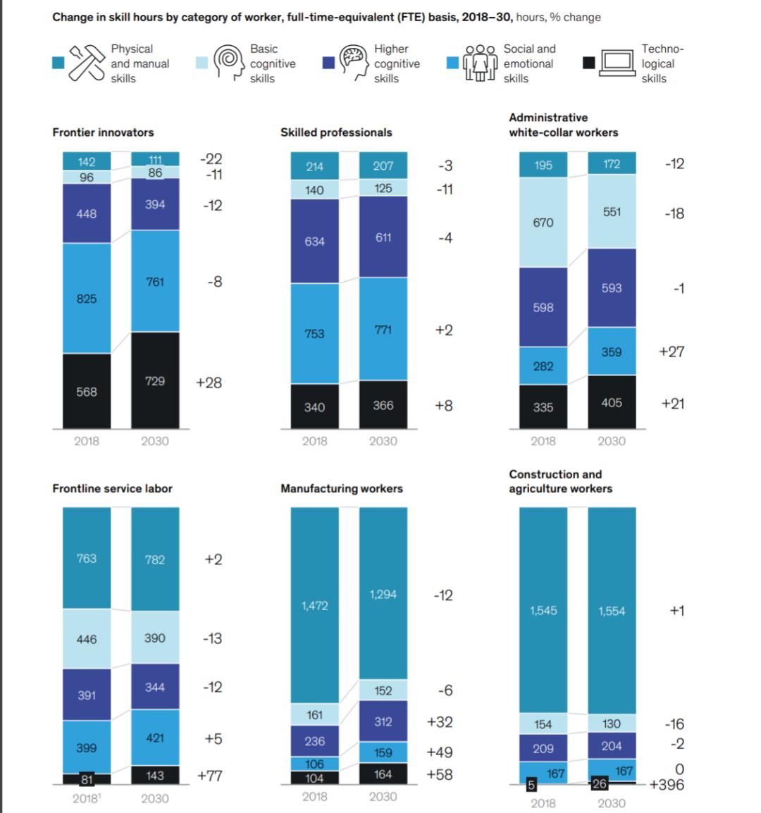 总体而言,对体力和手动技能,以及基本认知的需求分别下降18%和11%。但对社交和情感、技术技能的需求将分别增长18%和51%。