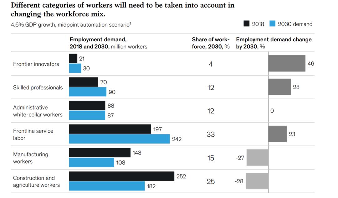 具体到六大劳动力类别,变化如图。前沿创新者的需求可能会增长46%,熟练技术人员的需求会增长28%;一线服务类别的员工增长为23%。而制造工人下降27%,建筑业和农业工人下降了28%。很明显,制造工人将需要适应自动化和数字化制造,从工厂车间打工过渡到担任高级职务,或进入需求增长的服务行业。