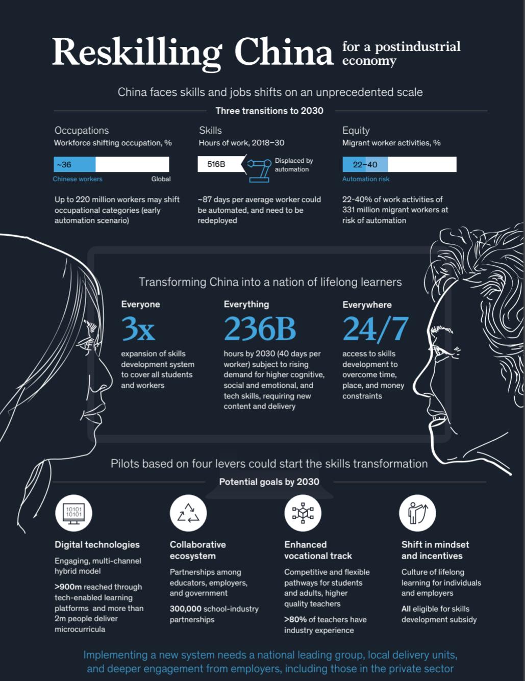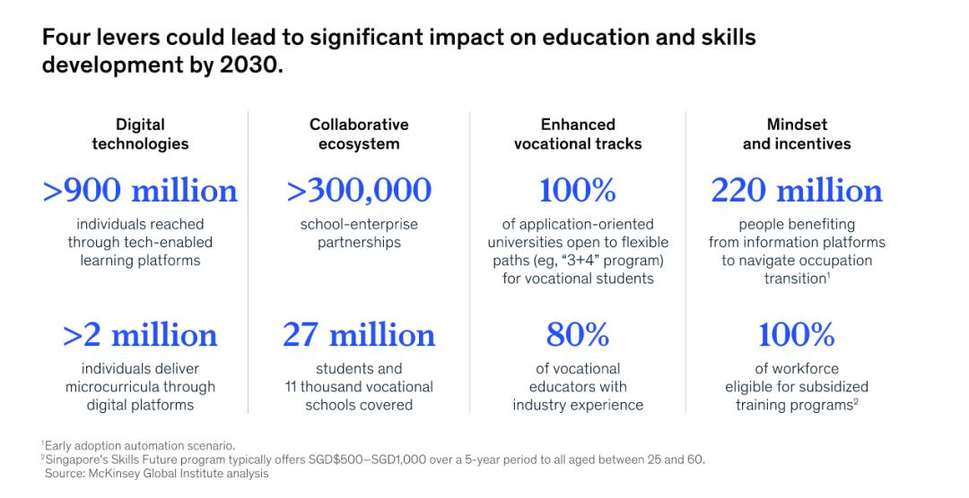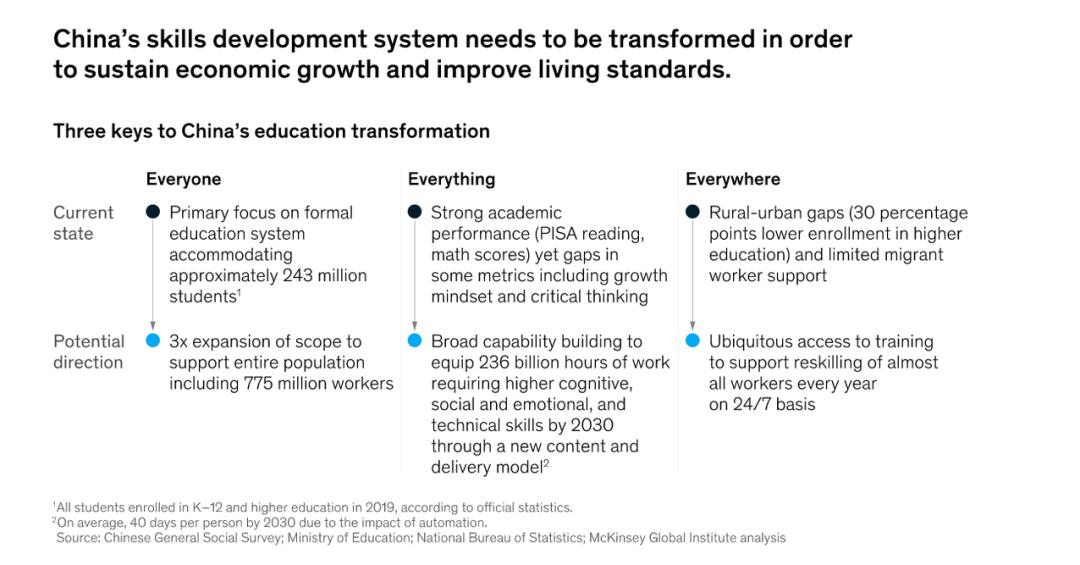 麦肯锡全球研究所(MGI)的最新报告「Reskilling China :Transforming the world’s largest workforce into lifelong learners」(文末可下载) 从经济角度评估了当今中国教育和培训体系,尤其关注技能发展。提出后工业社会的教育培训将走向三个「E」,亦即每个劳动力需要终身学习而且教育培训将无处不在。