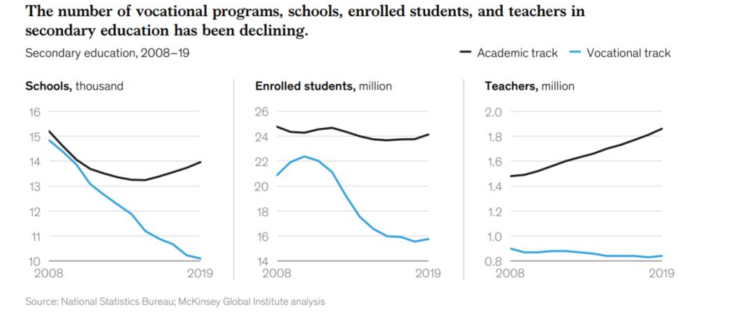 尽管对高技能职业工人的需求一直在上升,但职业学校、在校生和教师的数量一直在下降。