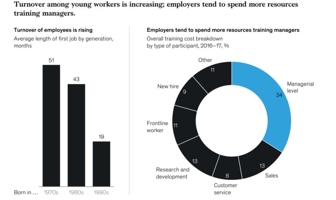 年轻工人的流动率正在上升; 雇主往往会花更多的资源培训经理。