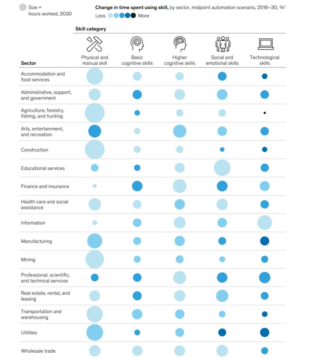 到2030年所需的技能转移因行业而异,圆圈大小代表工作时长,颜色深浅代表变化大小。比如制造业,需要发挥技术技能工作时间增幅最显著。
