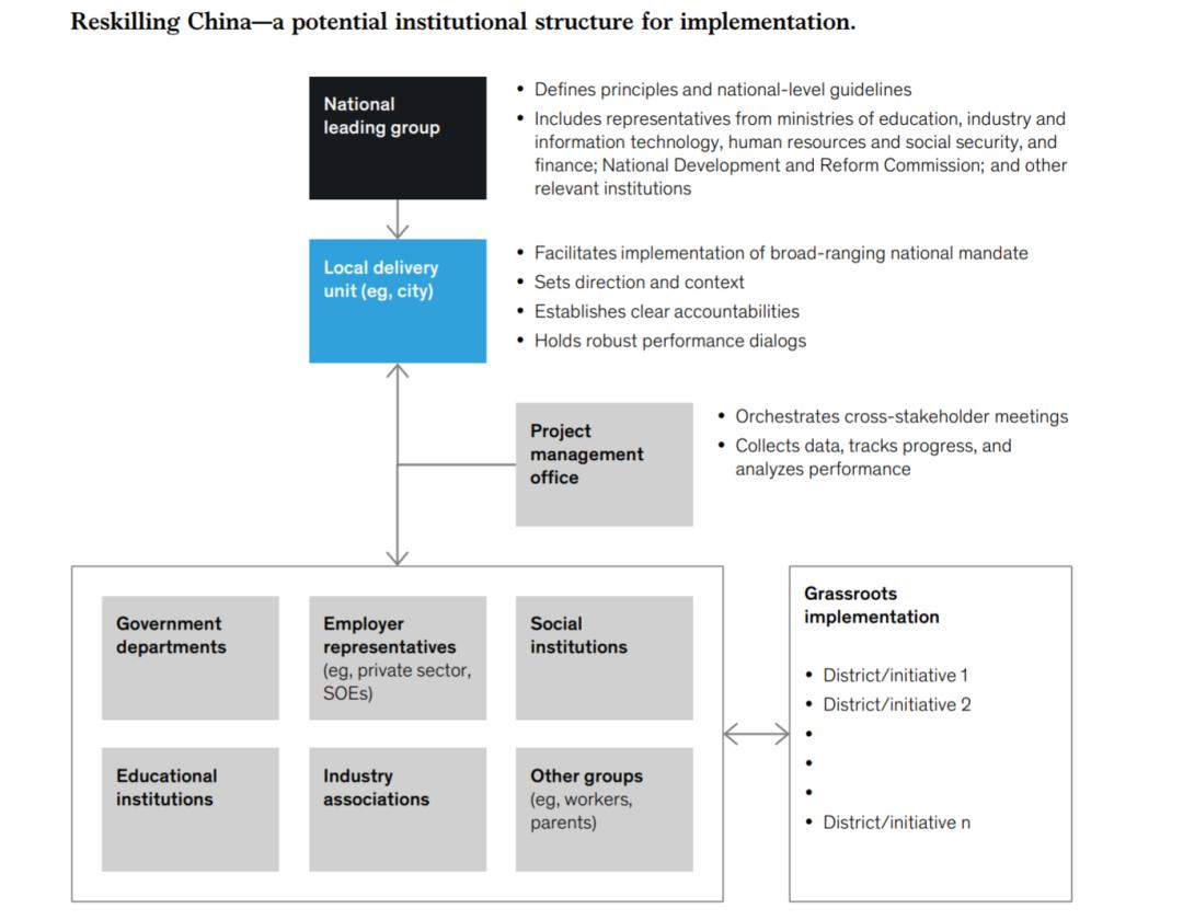 在国家层面,中国经常利用「领导小组」和其他跨职能的组织方式来处理复杂和跨部门的议程。按照这种方式,将意味着成立一个关注未来工作的全国领导小组,由多个部委的官员组成。这个小组反过来将寻求教育和职业机构代表、雇主和一系列主题专家的意见。