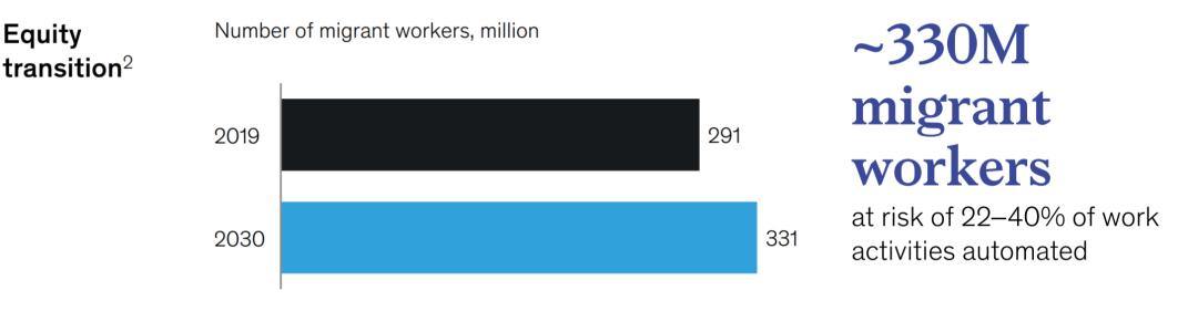 公平。这种转型对中国的城乡流动人口而言,尤其具有挑战性。随着中国继续城市化,2019年中国的城乡流动人口为2.91亿,到2030年可能达到3.31亿。由于中国实行户籍制度,许多移民无法平等获得医疗,教育和培训计划等服务。许多移民不仅工资低,技能低,而且其工作的22%至40%(约1510亿至2770亿小时或人均57至105天)容易受到自动化的影响。因此,需要特别注意帮助农民工进行必要的过渡。