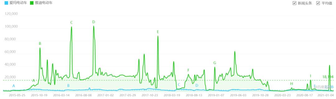 与此同时,根据2015年至今的百度指数,雅迪电动车显然更胜一筹,爱玛的品牌关注度似乎一直不温不火。