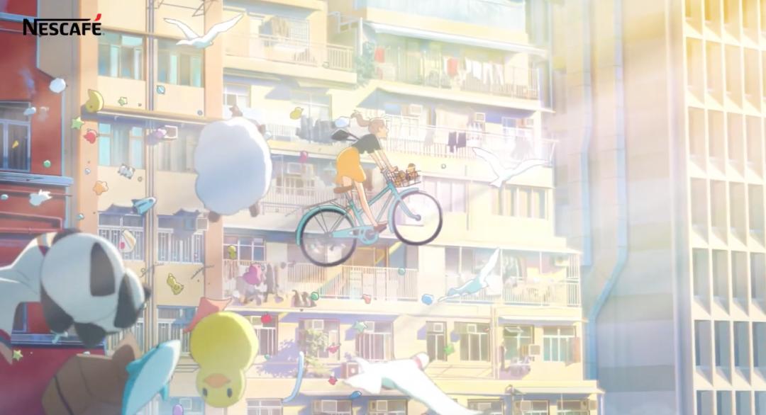 动漫中女生着急出门面试,骑车去面试的路上意外地获得了一些雀巢咖啡,在之后赶路途中,她将这些咖啡分发给了需要的人,还顺路把一名赶车的男生载到了附近的车站。这些来自女生的帮助,让人们的脸上逐渐露出笑容。