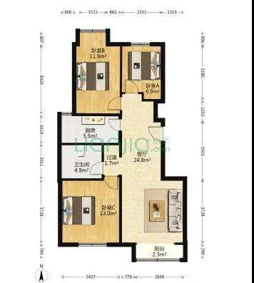 例如这个户型,为2014年建的北京某小区,该户型是建筑面积为93.63平米的小三居的房子,看起来户型不错,但其中阳台2.3平米,这个平米大小的阳台只能作为晾晒衣服。