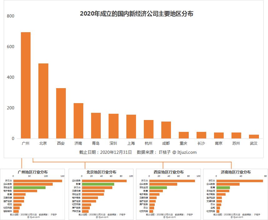 在几个重点城市中,除了一直热门的新工业、企业服务外,广州在生活服务、电子商务上占据主导,北京的教育、文娱行业成为 2020 年创业的高潮。