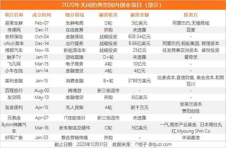 在此,我们对 2020 年死亡的创业项目做一次年终复盘,并挖掘到了一些值得关注的点: