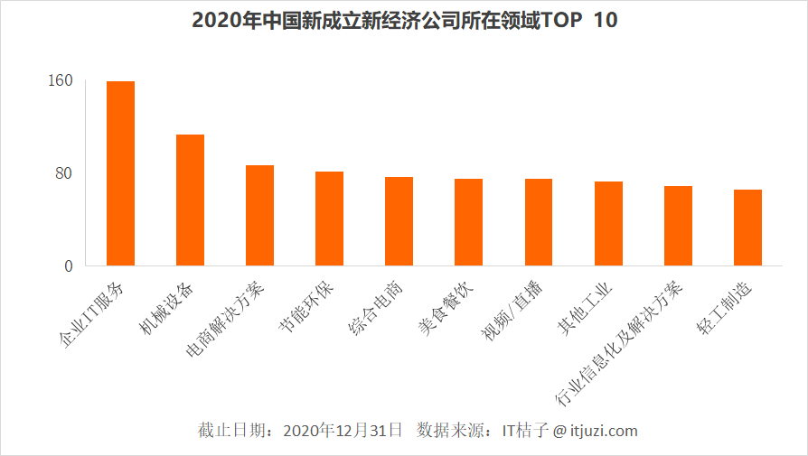 2020 年中国新成立的新经济创业公司主要集中在企业 IT 服务、机械设备、电商解决方案、节能环保、美食餐饮等行业。除了大势所趋的 to B 创业外,新的餐饮食品消费品牌、直播带货风潮引领的相关创业机会等成为热门。此外,中国进入工业智能化时期,在以 5G 为标志的新一轮技术突破期,信息化产业、智能制造产业、生物生命产业、绿色环保产业等新经济产业全面进入探索期。