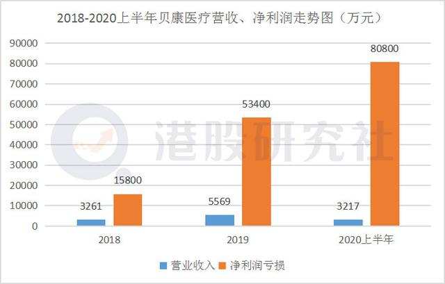 财报显示,2018-2019年,贝康医疗的主营收入分别约为3261万、5569万,2020年上半年,营收为3217万,同时净利润方面,也分别亏损1.58亿、5.34亿和8.08亿。两年半的时间,贝康医疗亏损额累计高达15亿元。