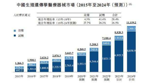 据Frost&Sullivan数据显示,中国生殖遗传学医疗器械市场从2015年的13亿元增长至2019年的34亿元,复合年增长率达28.4%,2019年至2024年预计将以26.5%的增长速度进一步发展,2024年生殖遗传学医疗器械市场将高达112亿元,其中检测试剂将达到89亿元,医疗设备将达到23亿元的规模。