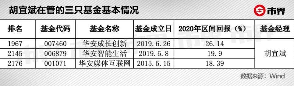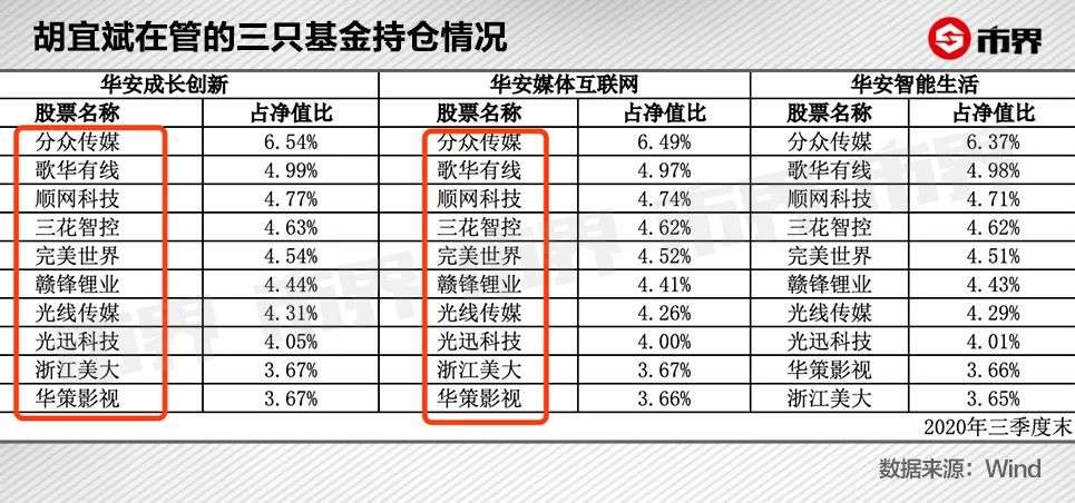 以华安基金胡宜斌为例,他在管的产品有4只,除了一只是科创主题基金外,其余3只混合型基金的前十大重仓股都是分众传媒、歌华有线、顺网科技、三花智控、完美世界、赣锋锂业、光线传媒、光迅科技、浙江美大和华策影视。