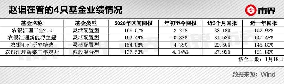 2020年,赵诣管理的四只基金年度回报率分别高达166.57%、163.49%、154.88%和137.52%。