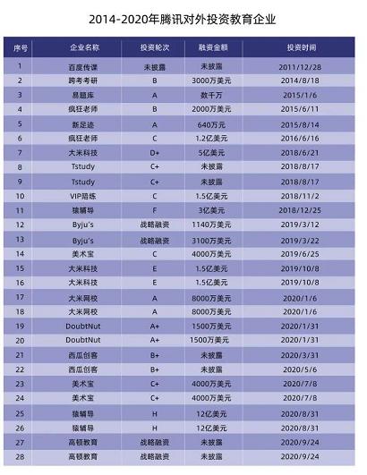 在2020 年,在线教育领域多起大额投资事件中都可以见到腾讯(HK:00700)的名字:国庆节前夕,腾讯完成了对高顿教育的新一轮融资;2020 年 10 月 12 日,火花思维宣布完成 1 亿美元的 E2 轮融资,成为十一假期结束后教育圈的第一起融资事件,而腾讯就名列投资者之中,这已经是本年内腾讯第8次在教育领域有所动作。