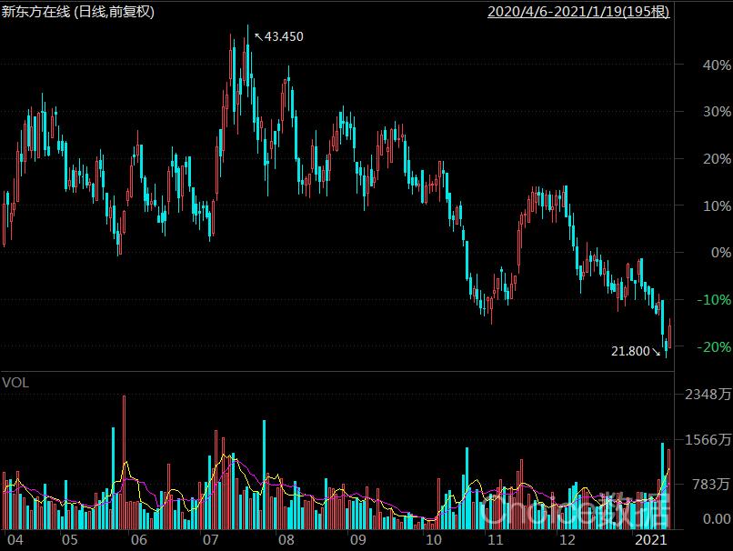 不过,从从新东方在线2020年股价高点43港元跌到现在23.85港元(截至2021年1月19日收盘),投资人的耐心究竟还有多少,也要打一个问号。