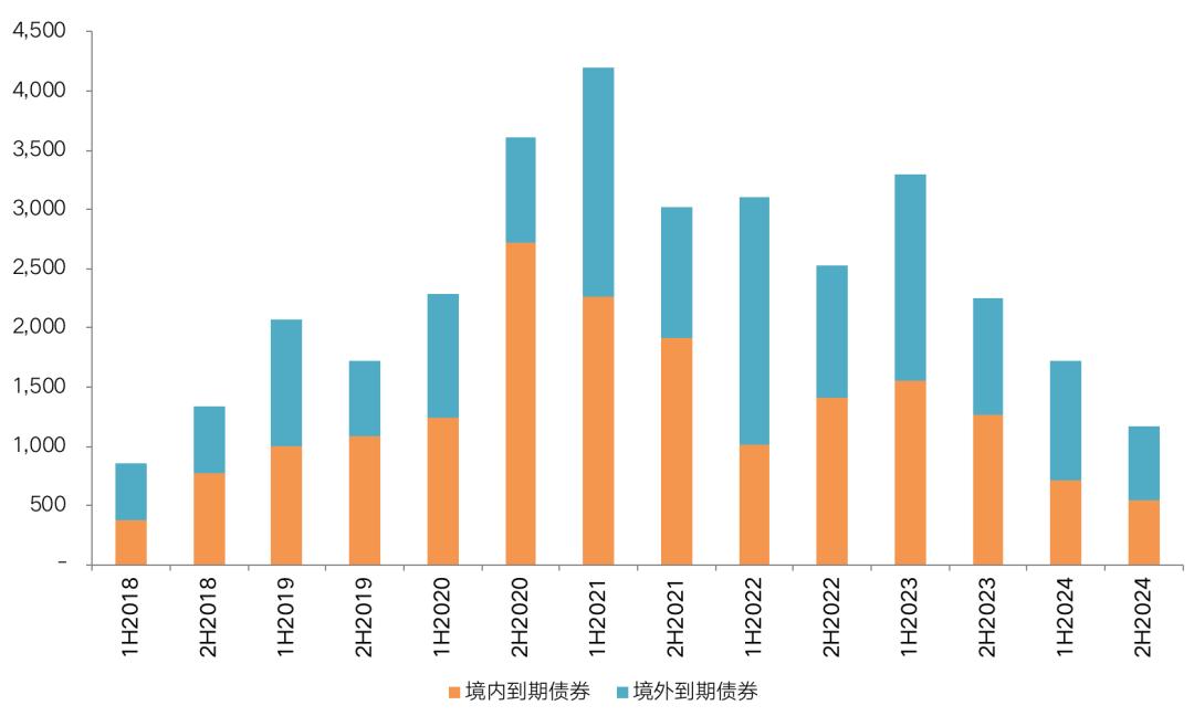 另一方面,在2016年年底境内债发行受限后,房企发债转向海外,2017年开启海外债潮“元年”,2-5年的发债年限是主力,所以房企近几年境外的到期量均较大。