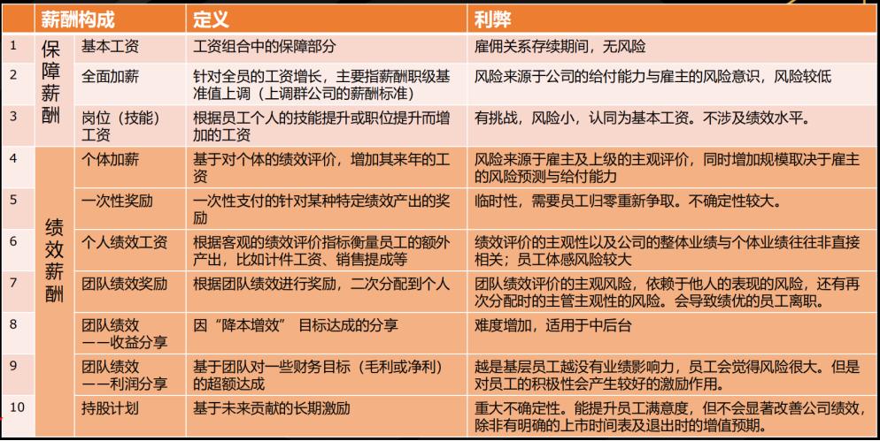整个的薪酬结构的风险系数是从上到下,员工也是从上到下感到风险越来越大的。越低风险的薪酬,员工保障性能就越强,但激励效果就越低。