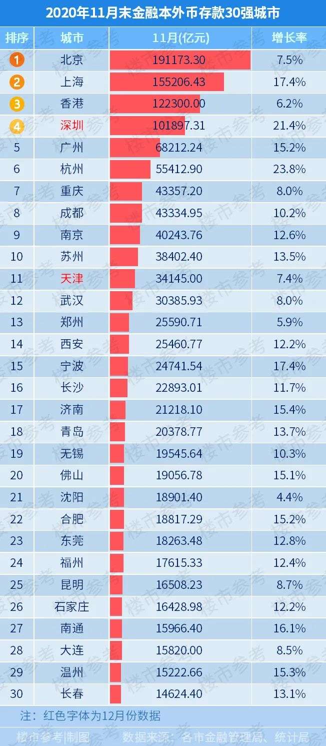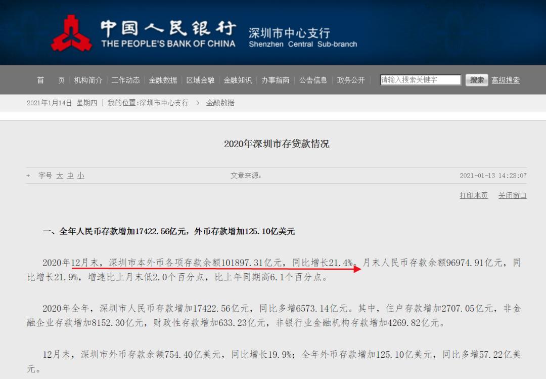 深圳12月份金融机构本外币存款余额101897.31亿元,同比增长21.4%,是中国第四个超十万亿存款的城市。