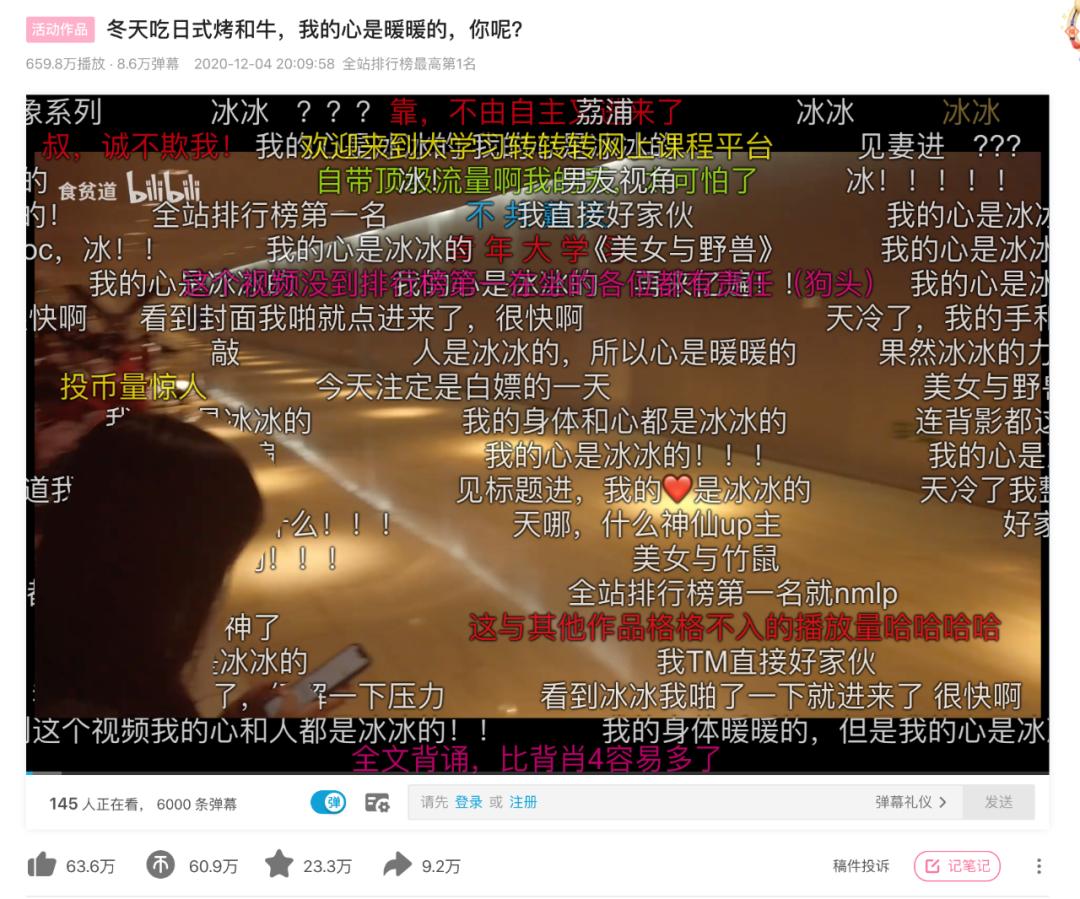 我们再来看看一个关于王冰冰很火的视频,那就是饼叔12月4日发布的《冬天吃日式烤和牛,我的心是暖暖的,你呢?》,这个视频截止目前659.8万播放,也是全站排行榜最高第1名,前排弹幕已经回答了标题,“我的心是冰冰的”。