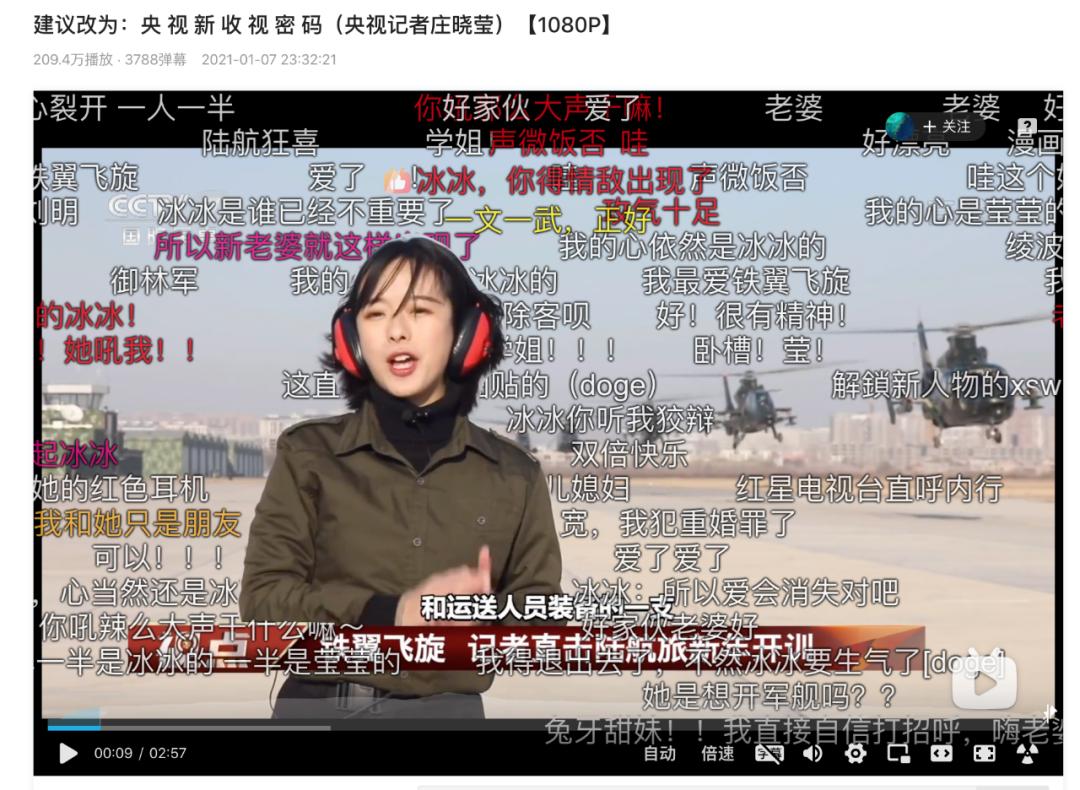 另外,王冰冰在B站走红之后,“国家队”迅速借势王冰冰传播营销,不断推动王冰冰相关的话题发酵裂变,提升内容的“含冰量”,甚至是在B站的一些官方传播中都会打上王冰冰相关的标签,疯狂输出,在央视的直播活动中我们也能多次看到王冰冰的身影,这一次央视记者走红可以说是将主流媒体的影响力再次推向了年轻人受众中。