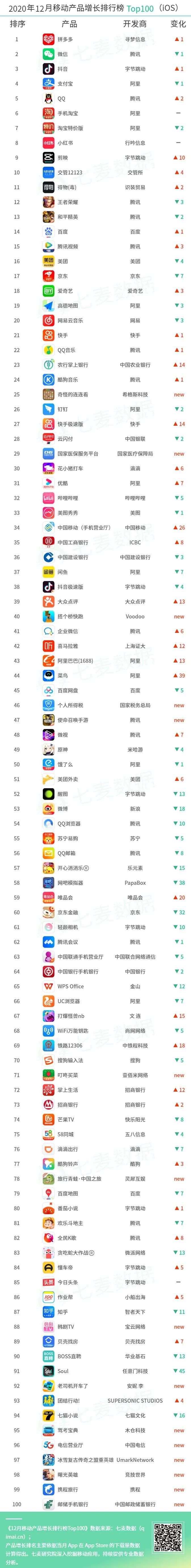 在 12 月的移动产品增长排行榜 Top100 中,应用类 App 与游戏类 App 占比为 84:16,应用类App数量仍大比例多于游戏类App。「拼多多」霸榜12月增长榜,同样主打下沉市场的「淘宝特价版」虽排名下降2名,但仍在Top 10以内。