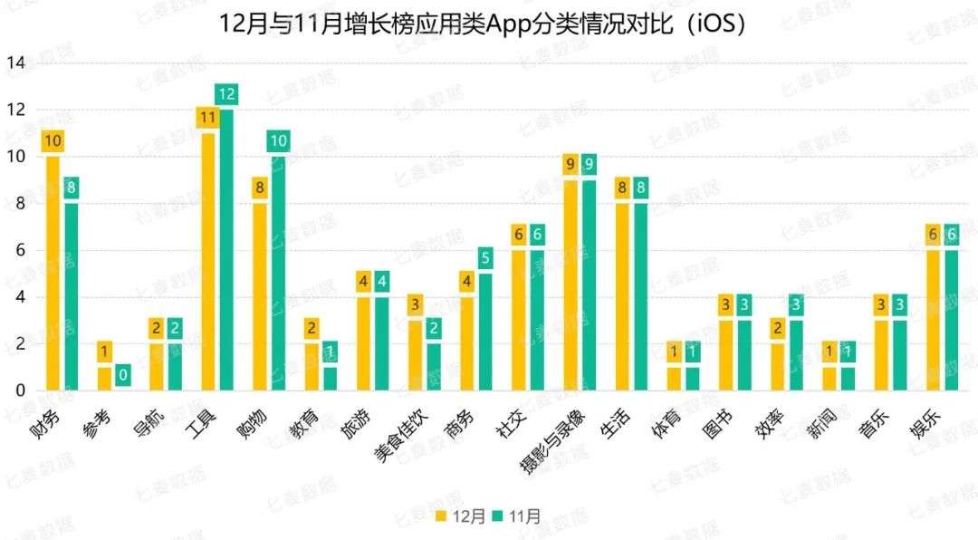 12 月增长榜的应用类产品共有 84 款,与11月数量持平;从应用类型看,工具类产品虽然减少了 1 款,仍以11款的上榜数量居于首位,财务类产品以10款居于Top 2,摄影与录像类产品以9款位于Top 3;在产品数量上,所有类别的产品数量与11月相比变化都不大。