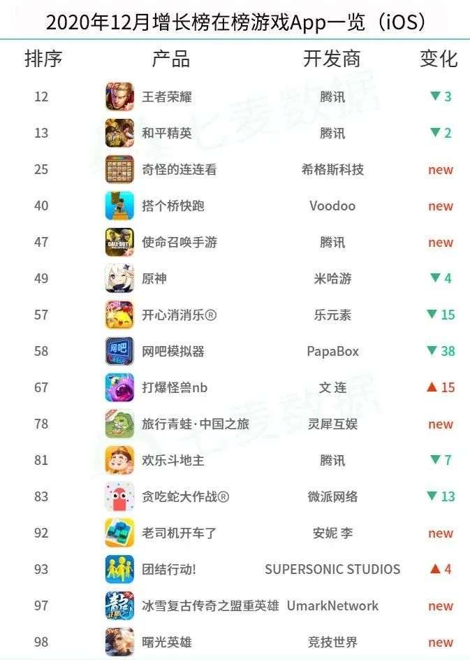 在此次移动产品增长榜入围的 100 款产品中,上榜的游戏 App 共16 款,与 11 月持平。