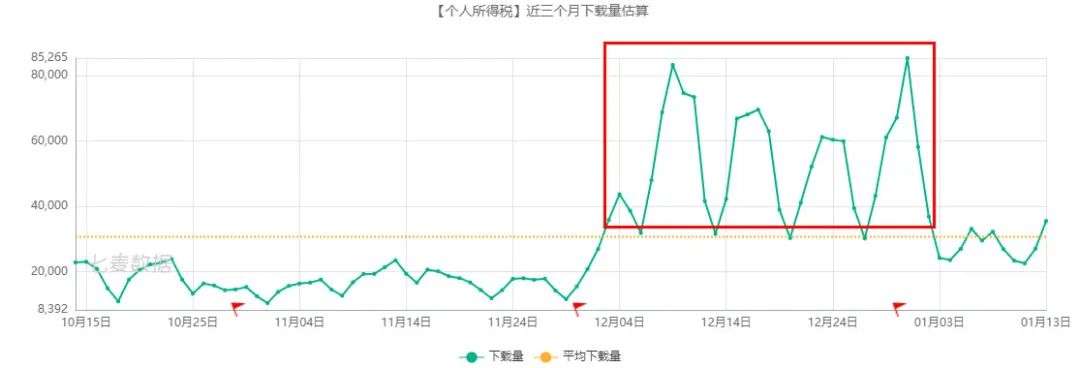 这件与个人收入紧密相关的事情,吸引“打工人”们一致关注,12月4日当天,「个人所得税」下载量有显著增加,超过平均下载量,12月31日下载量达到当月峰值8.5w+,当月累计预估下载量(iOS端)达159w+。