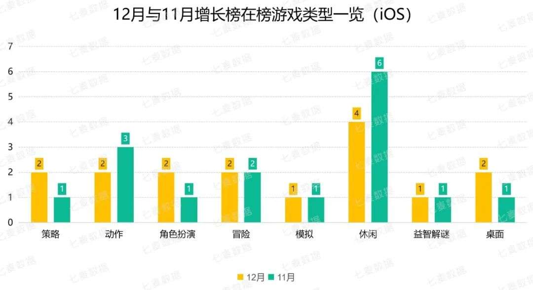 从游戏类别看,12月增长榜中休闲游戏数量较11月减少2款,但仍以4款占据首位,其余类型游戏大多上榜2款,数量较稳定。从类别和排名上来看,休闲游戏总体排名比较靠前。