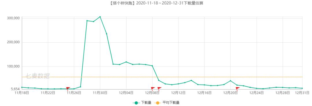 从七麦数据后台监测到的榜单排名趋势和预估下载量(iOS端)数据来看,该游戏在12月多次霸榜游戏免费及游戏-休闲免费榜Top 1,预估下载量(iOS端)在12月初也有爆发式增长。