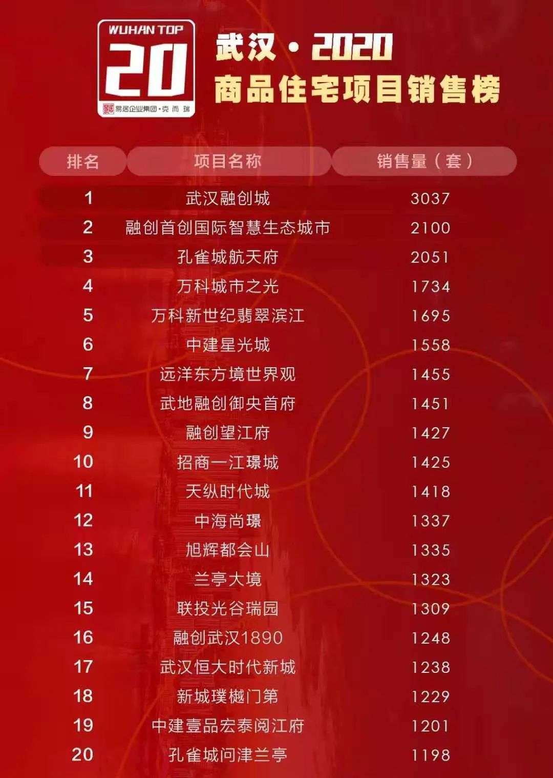 2020年武汉新建商品房成交20.12万套,其中,新建商品住房成交17.54万套,面积1961万平米,位居全国城市住房销量第一位。