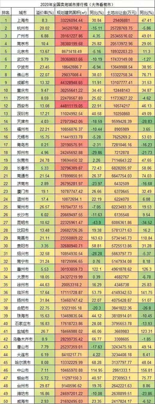 据统计,2020年,武汉土地出让金达到1901亿元(全口径),超过2019年1765亿元,创历史新高,位居全国第六。